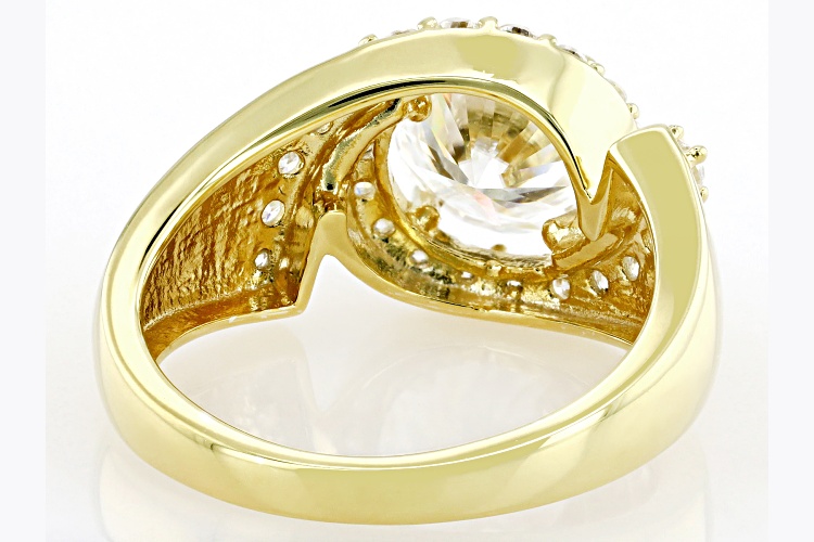 Moissanite Fire® 2.54ctw diamond equivalent weight round brilliant, 14k yellow gold over sterling silver bypass style ring. Measures approximately 11/16"L x 7/16 "W and is not sizeable. Actual moissanite weight is 2.00ctw.