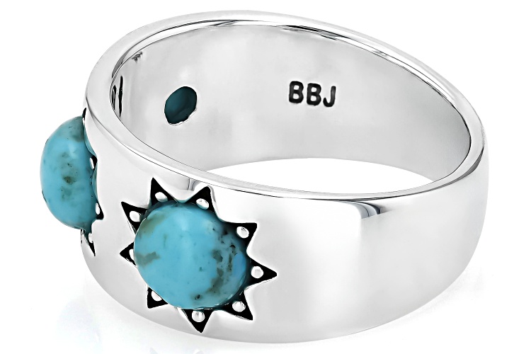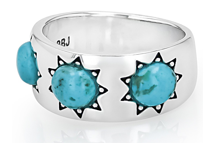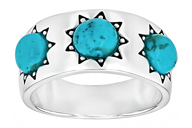 Southwest Style by JTV™ 5.5mm Round Blue Composite Turquoise Sterling Silver Sun Band Ring. Measures approximately 0.90"L x 0.38"W. Not sizeable. This product contains composite turquoise. This means separate pieces of turquoise were bound together.