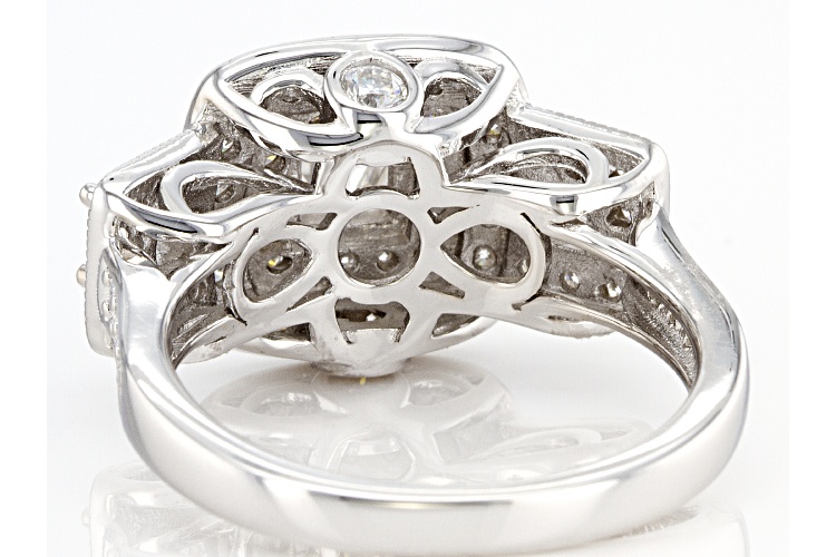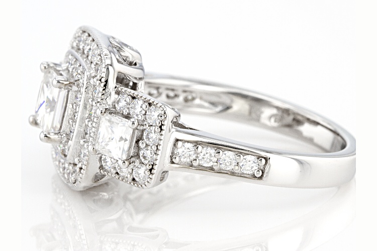 Moissanite Fire(R) 1.96ctw diamond equivalent weight octagonal princess cut and round, Platineve(R) ring. Measures approximately 7/16" L x 1/16" W and is not sizeable. Actual moissanite weight is 1.40ctw.
