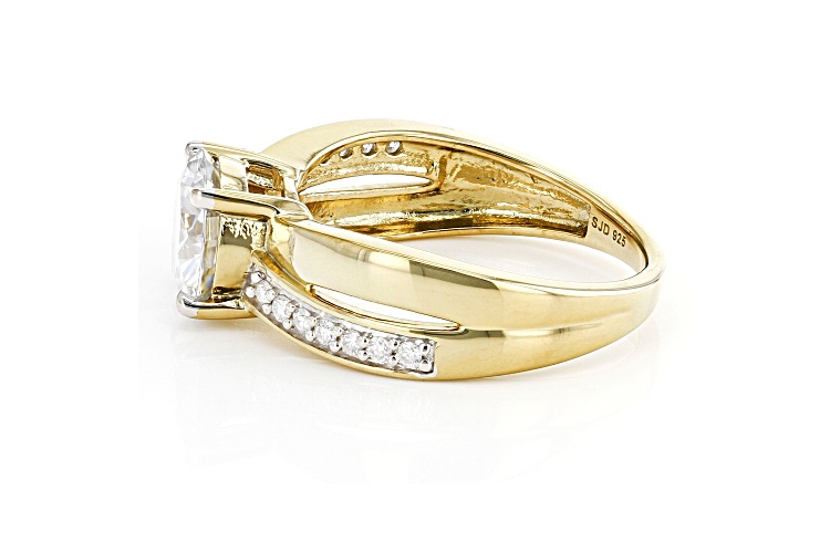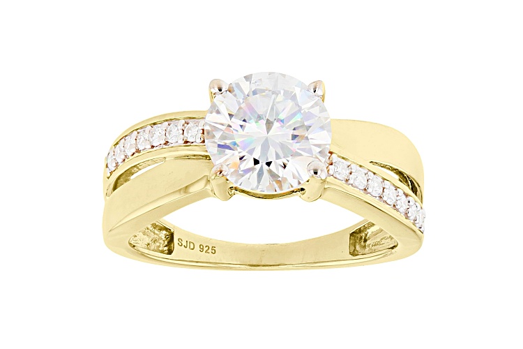 Moissanite Fire(R) 2.04ctw diamond equivalent weight round, 14k yellow gold over sterling silver ring. White rhodium settings. Measures approximately 1/4" L x 1/16" W and is not sizeable. Actual moissanite weight is 1.74ctw. Comes with certificate of authenticit