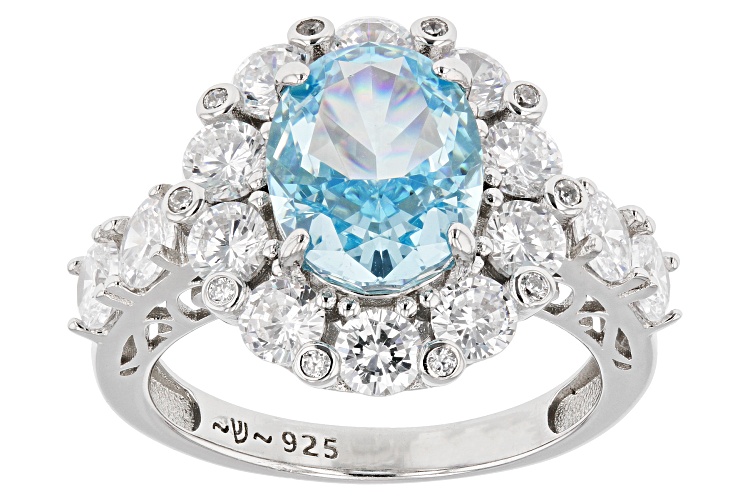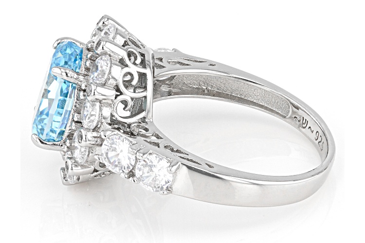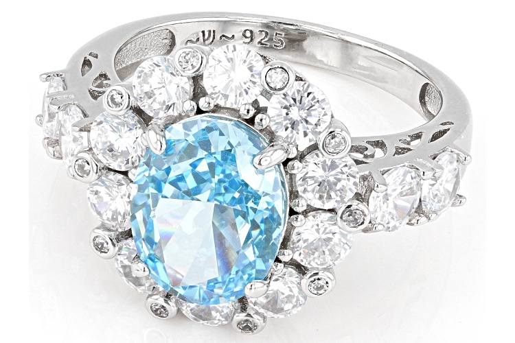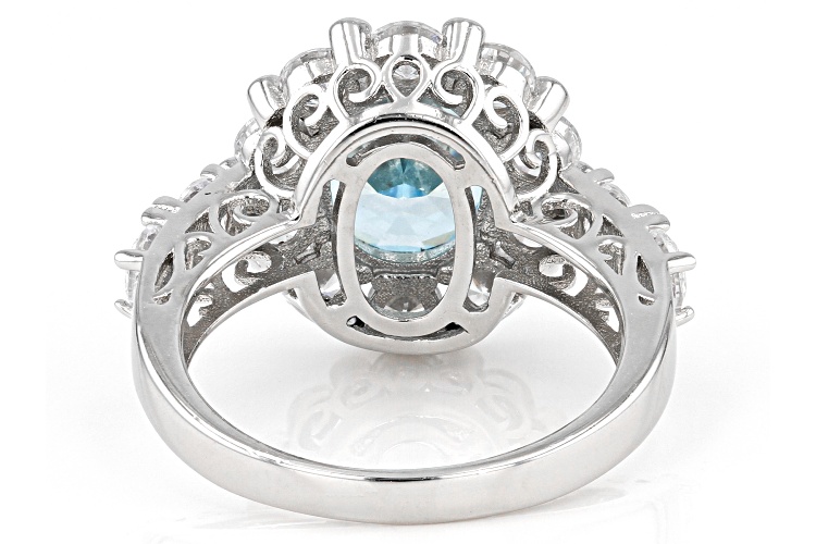 Bella Luce® aquamarine and white diamond simulants 7.22ctw oval fire cut and round, rhodium over sterling silver ring. Measures approximately 0.88"L x 0.63"W and is not sizable.