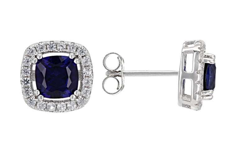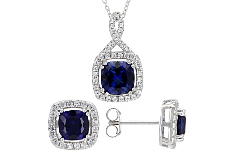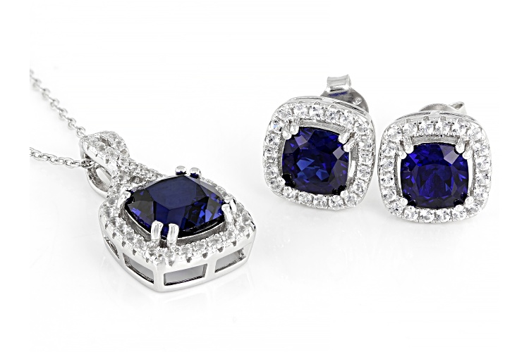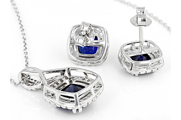 5.20ctw Cushion Lab Created Blue Sapphire With 0.85ctw Round Lab Created White Sapphire Rhodium Over Sterling Silver Pendant With 18" Cable Chain And Stud Earrings Set. Pendant Measures Approximately 0.84"L x 0.47"W. Spring Ring Clasp. 2.5mm Bail. Earrings Measure Approximately 0.40"L x 0.40"W. Push Back Backings.