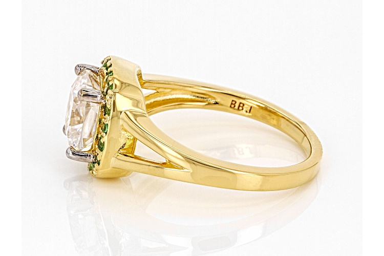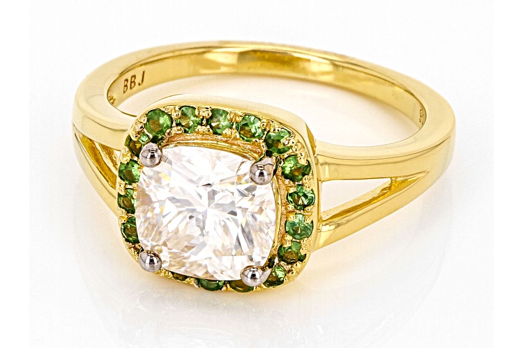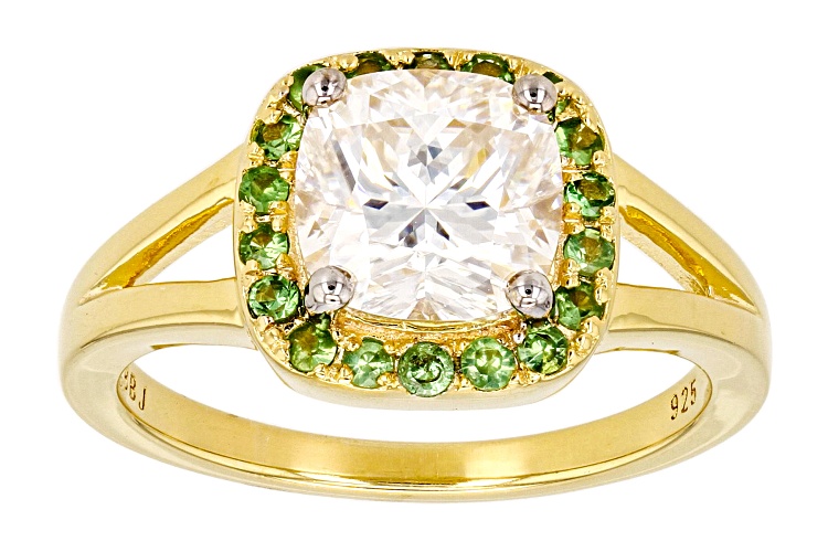 Moissanite Fire® 2.00ct diamond equivalent weight cushion cut and .30ctw round Tsavorite Garnet 14k yellow gold over sterling silver ring. Measures approximately 3/8" L x 1/16" W and is not sizeable. White rhodium setting. Actual moissanite weight is 1.80ct.