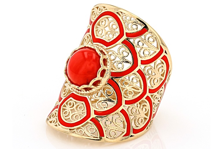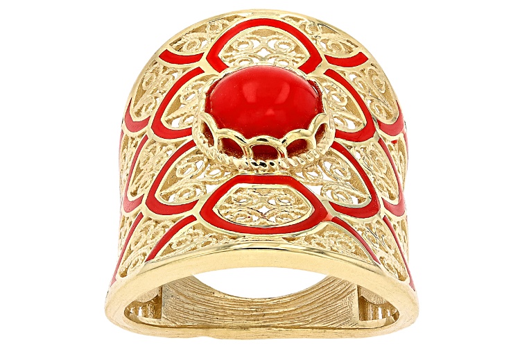 • Artisan Collection of Turkey™ 8mm Red Coral & Enamel 18K Gold Over Sterling Silver Ring - Size 6