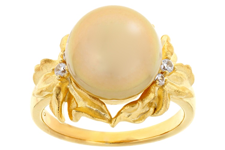 11mm Golden Cultured South Sea Pearl With White Zircon 18k Yellow Gold Over Sterling Silver Ring - Size 11