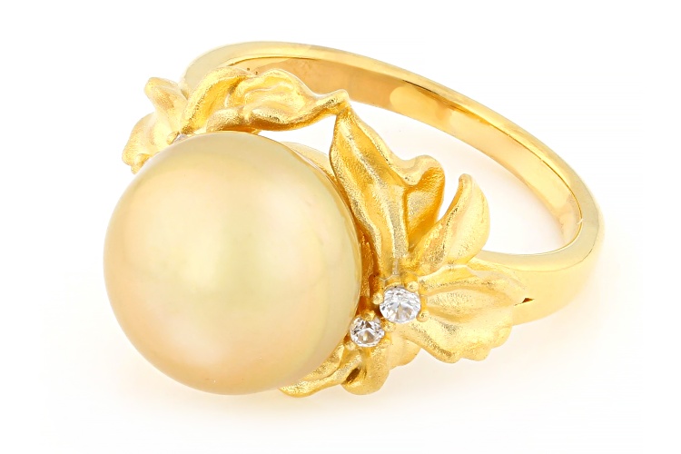 11mm Golden Cultured South Sea Pearl With 0.20ctw White Zircon 18k Yellow Gold Over Sterling Silver Ring. Measures approximately 3/4" L x 9/16" W and is not sizeable. Colors, shapes, and sizes may vary. Accent stones primarily zircon.