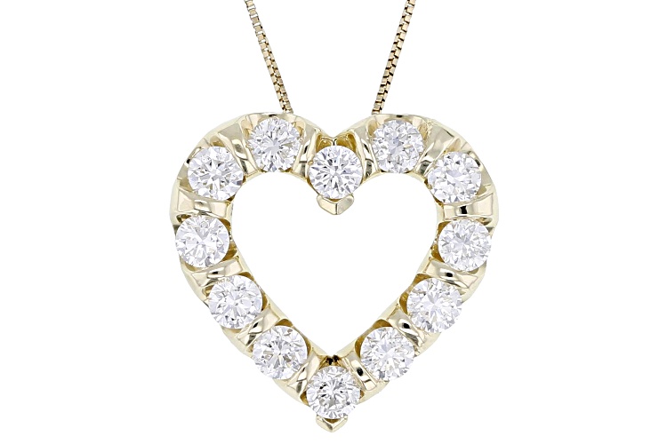 Prazana® Lab-Grown Diamonds 1.00ctw round white lab-grown diamond, 10k yellow gold heart slide pendant. Suspends from an 18 inch box chain with a spring ring clasp. Measures approximately 5/8"L x 5/8"W and has a 1.5mm bail. H color, SI clarity minimum.