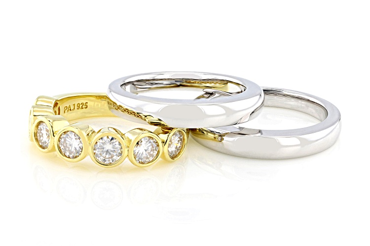 Moissanite Fire® 1.61ctw diamond equivalent weight round brilliant, Platineve® and 14k yellow gold over sterling silver set of three stackable rings. Measures approximately 7/8" L x 7/16" W and is not sizeable. Actual moissanite weight is 1.54ctw.