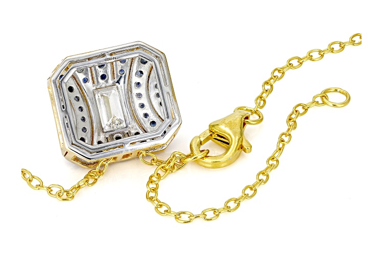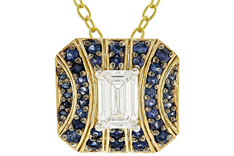 Gems En Vogue 1.00ct Emerald Cut Lab Grown Diamond With 0.73ctw Round Blue Sapphire Rhodium And 24k Yellow Gold Over Palladium Sterling Silver Pendant With 18" Chain. Lobster Claw Clasp. 2" Jump Ring Extender. Measures Approximately 0.55"L x 0.59"W. Center Stone is IGI Full Certificate F Color, VS2 Clarity Minimum.