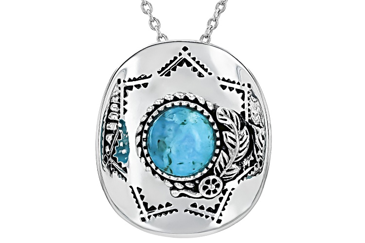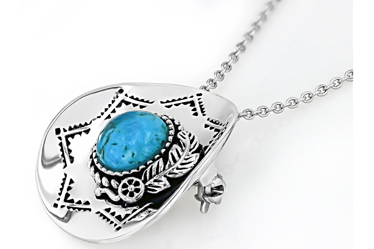 Southwest Style by JTV™ 9mm Round Composite Blue Turquoise Sterling Silver Cowboy Hat Brooch/Pendant/Chain. Measures approximately 1.08"L x 0.94"W. 2.7mm bail. Lobster claw clasp with a 2" extender. Joint and pin stem. Oxidized finish. This product contains composite turquoise. This means separate pieces of turquoise were bound together.