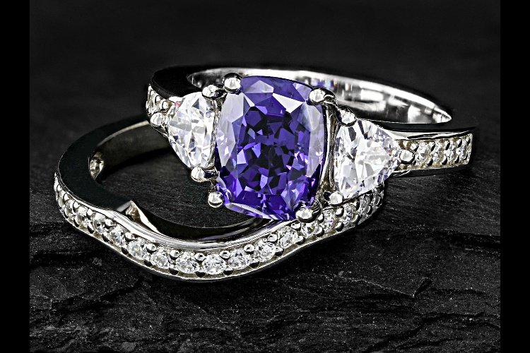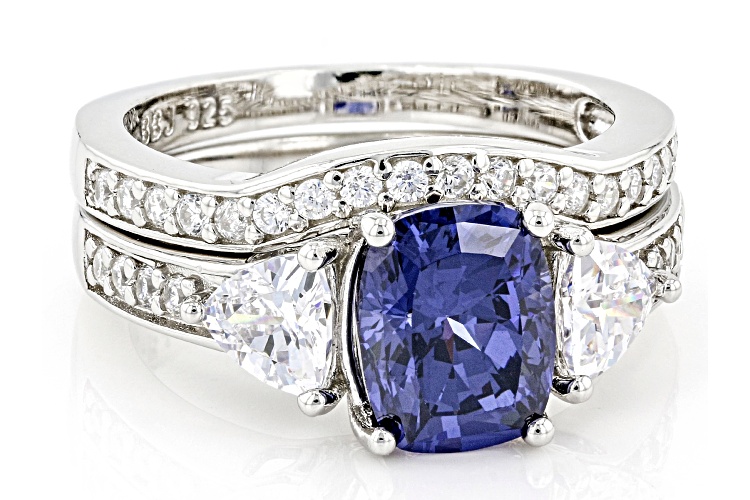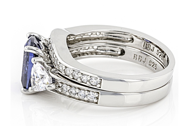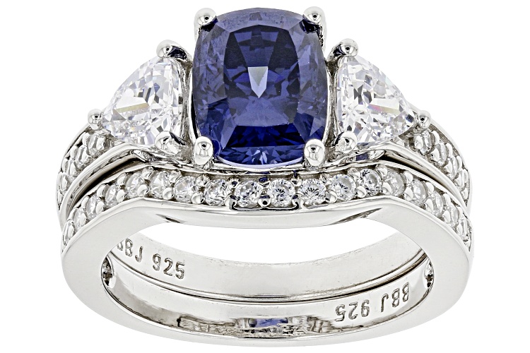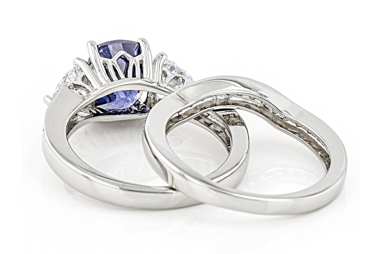 Bella Luce® Esotica™ tanzanite and white diamond simulants 4.26ctw rectangular cushion, round, and trillion, platinum over sterling silver 2 ring set. Measures approximately 0.81" L x 0.44" W and is not sizable.