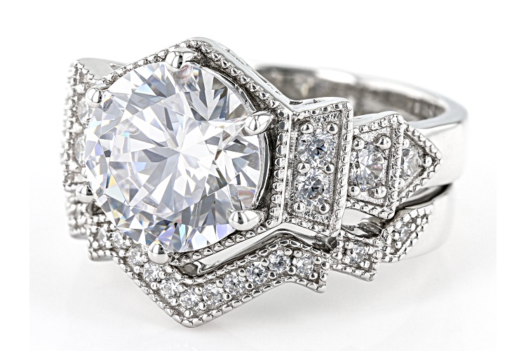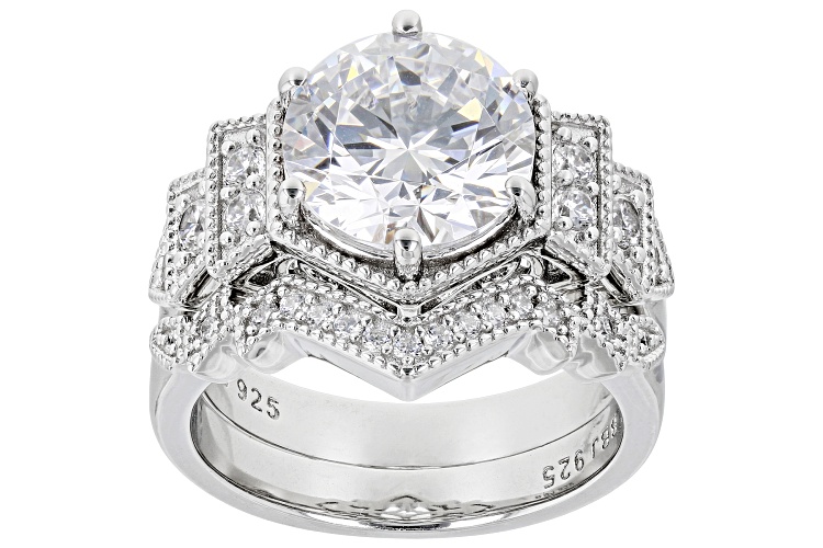 Bella Luce® white diamond simulant 7.45ctw round, rhodium over sterling silver 2 ring set. Measures approximately 0.81" L x 0.56" W and is not sizable. Diamond equivalent weight is 4.51ctw.