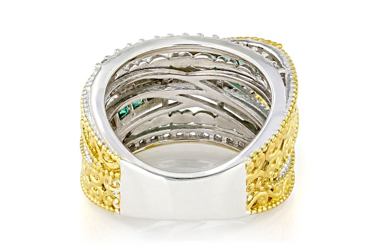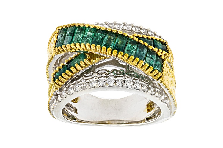 Gems En Vogue 1.58ctw Baguette Grizzly Emerald With 0.56ctw Round White Zircon Rhodium And 24K Yellow Gold Over Palladium Sterling Silver Highway Two-Tone Ring. Measures Approximately 0.87"L x 0.58"W. Not Sizeable.