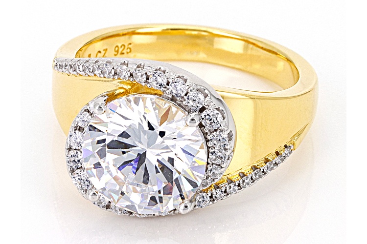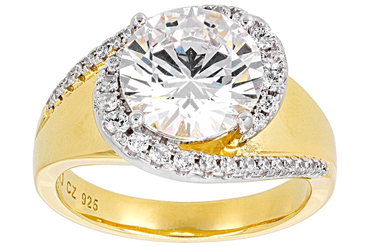 Bella Luce® white diamond simulant 6.23ctw round, Eterno™ 18k yellow gold over sterling silver ring. Measures approximately 0.81" L x 0.50" W and is not sizeable. The diamond equivalent weight is 3.77ctw.