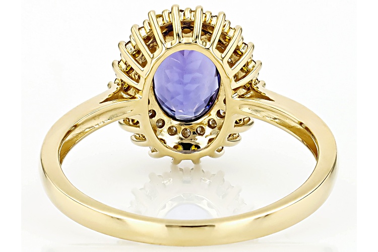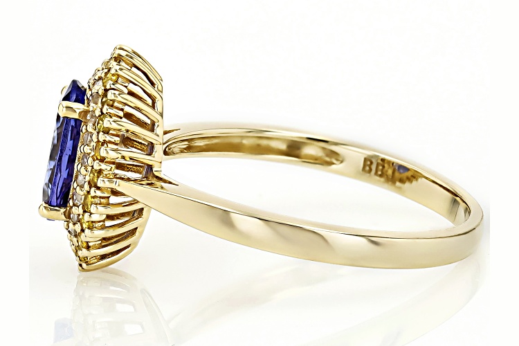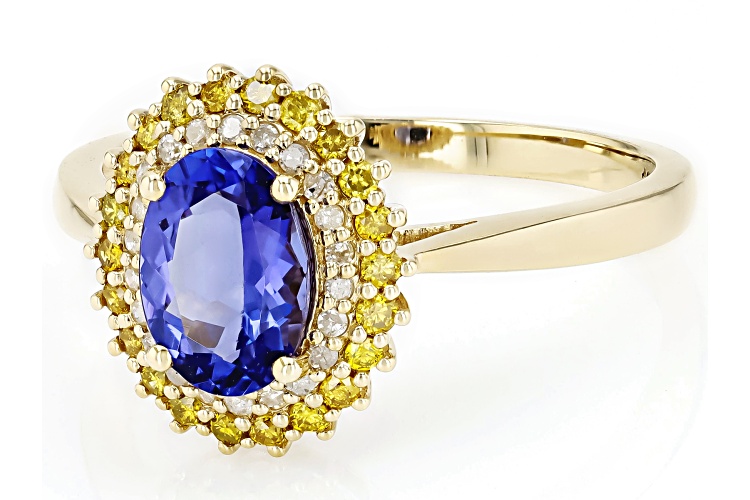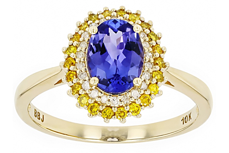 1.11ct Oval Blue Tanzanite With 0.21ctw Round Yellow Diamond And 0.11ctw Round White Diamond 10k Yellow Gold Ring. Measures Approximately 0.46"L x 0.51"W.