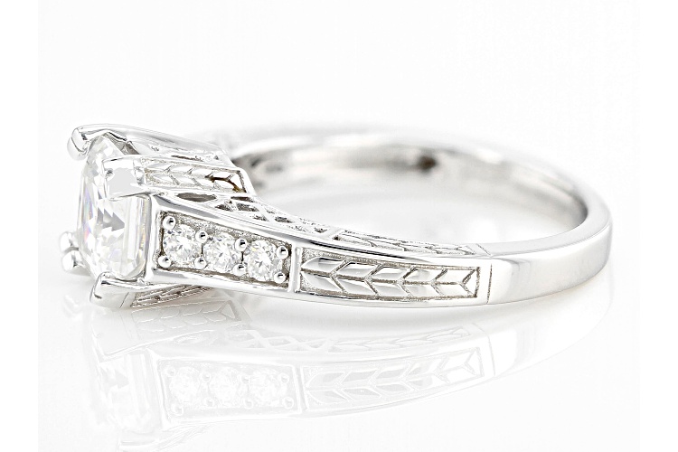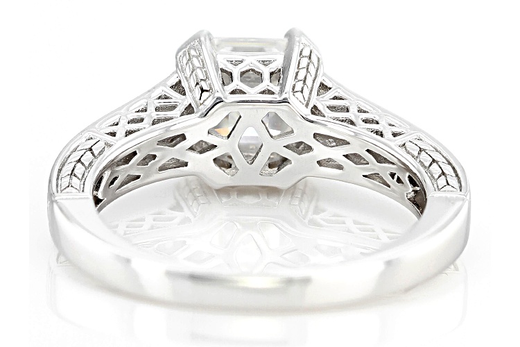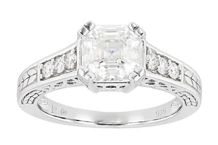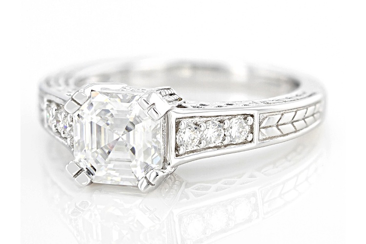 Moissanite Fire® 2.03ctw diamond equivalent weight asscher cut and round brilliant cut, Platineve® ring. Measures approximately 5/16" L x 1/16" W and is not sizeable. Actual moissanite weight is 1.79ctw.