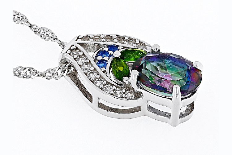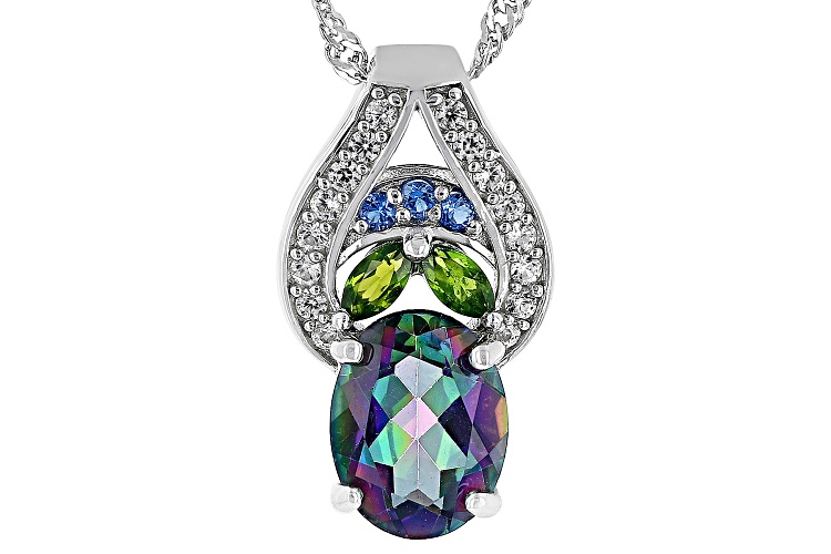 1.91ct Oval Mystic Fire® Topaz With 0.14ctw Marquise Chrome Diopside, 0.04ctw Round Lab Created Blue Spinel And 0.19ctw Round White Zircon Rhodium Over Sterling Silver Pendant White 18"Singapore Chain. Measures Approximately 0.74"L x 0.27"W. 2mm bail. Lobster clasp with 2"extender. Accent stones primarily zircon.