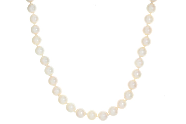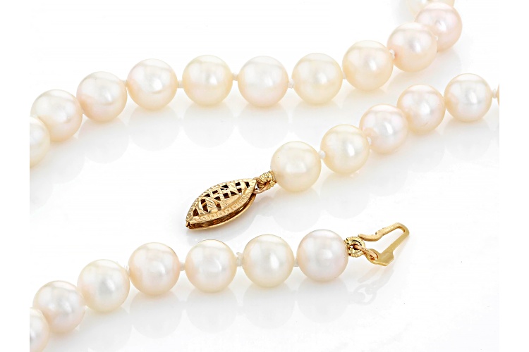 6mm White Cultured Japanese Akoya Pearl 14k Yellow Gold 18 Inch Strand Necklace. Measures approximately 1/4 of an inch in width and has a fishhook clasp. Colors, shapes, and sizes may vary.