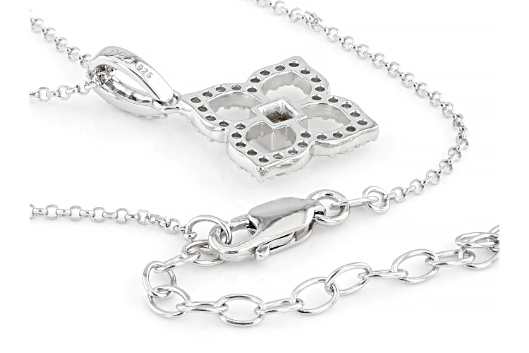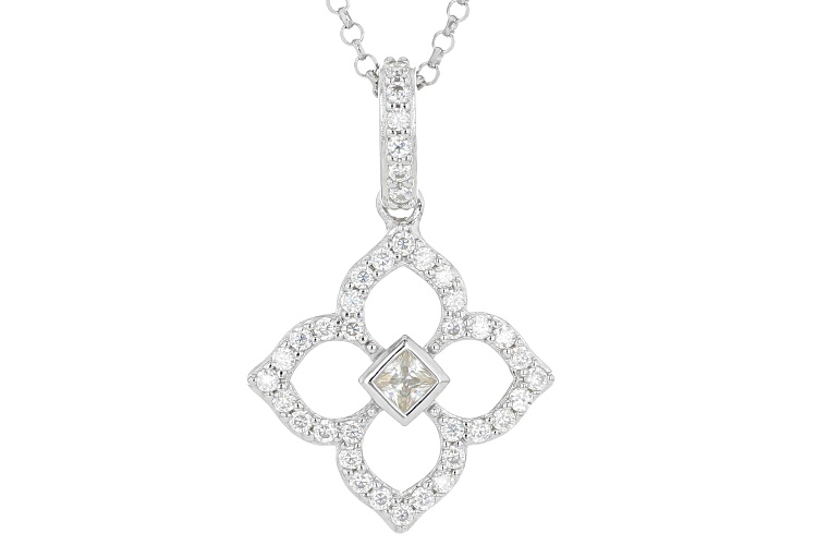 Moissanite Fire® 0.50ctw diamond equivalent weight square and round brilliant, Platineve® clover pendant with 18 inch rolo chain. Measures approximately 15/16" L x 5/8" W. Chain has a lobster clasp and a two inch extender. Actual moissanite weight is 0.49ctw.