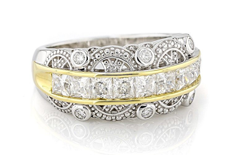 Moissanite Fire(R) 1.80ctw diamond equivalent weight square and round brilliant Platineve® with 14k yellow gold over platineve band ring. Measures approximately 7/16" L x 1/16" W and is not sizeable. Actual moissanite weight is 1.56ctw.