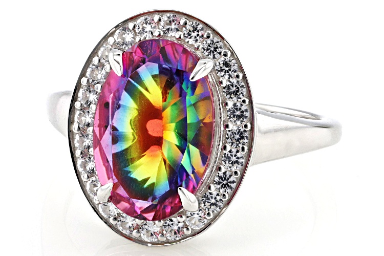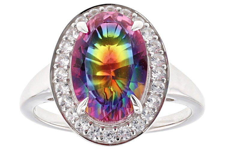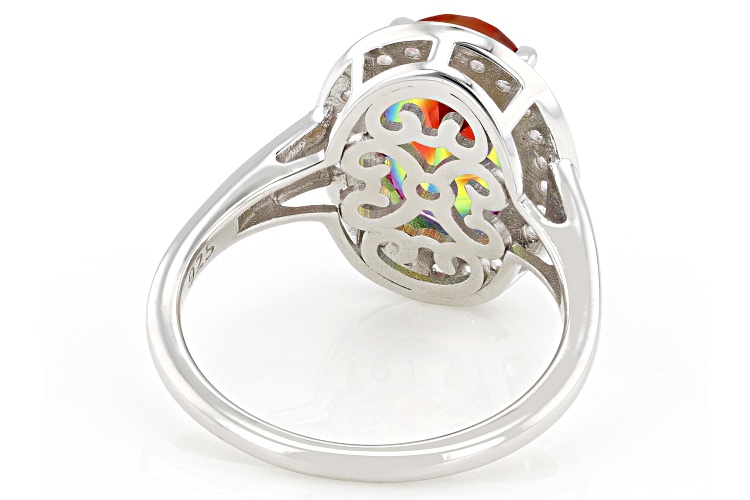 2.97ct Oval Rainbow Quartz Doublet with 0.32ctw Round Lab Created White Sapphire Rhodium Over Sterling Silver Ring. Measures Approximately 0.50"L x 0.62"W. Not Sizeable.