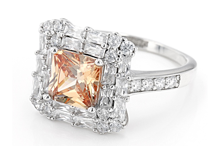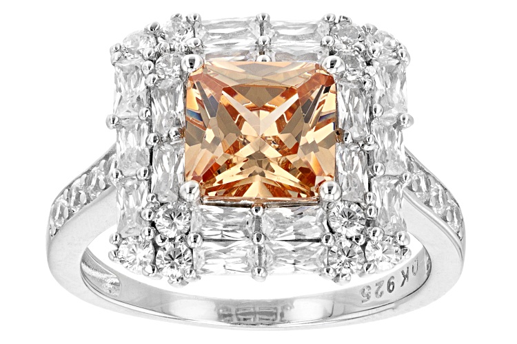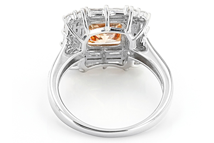Bella Luce® 2.16ctw 7mm Square Champagne and 1.95ctw Baguette and Round White Diamond Simulants Rhodium Over Silver Ring. Measures Approximately 0.84"L x 0.54"W, Shank 0.07"W, Not Sizable. The Diamond Equivalent Weight is 2.49ctw.