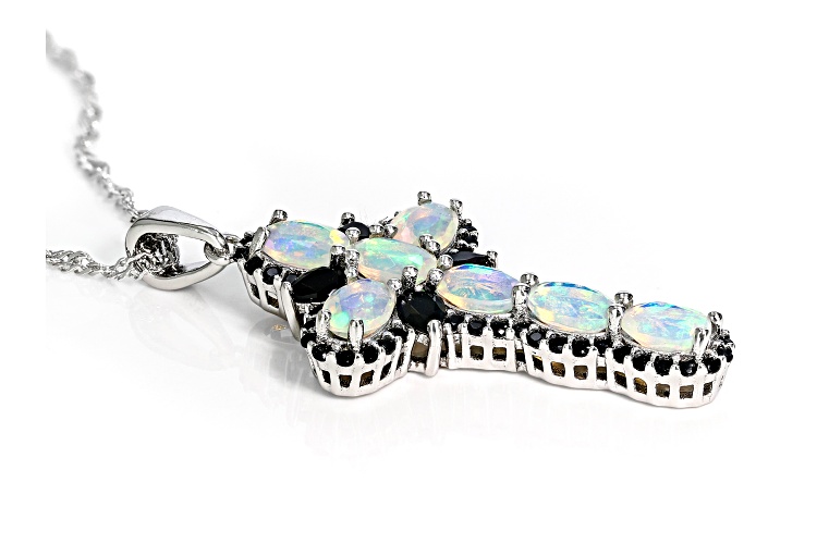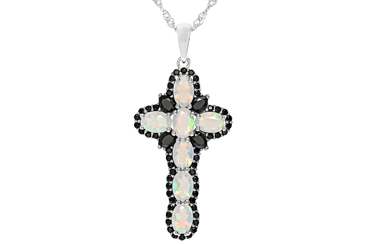 1.76ctw Oval Ethiopian Opal With 0.41ctw Pear Shape And 0.49ctw Round Black Spinel Rhodium Over Sterling Silver Cross Pendant With Chain. Measures Approximately 1.60"L x 0.76"W. 2.5mm bail. 18" Singapore Chain with 2" Extender. Lobster Claw Clasp.