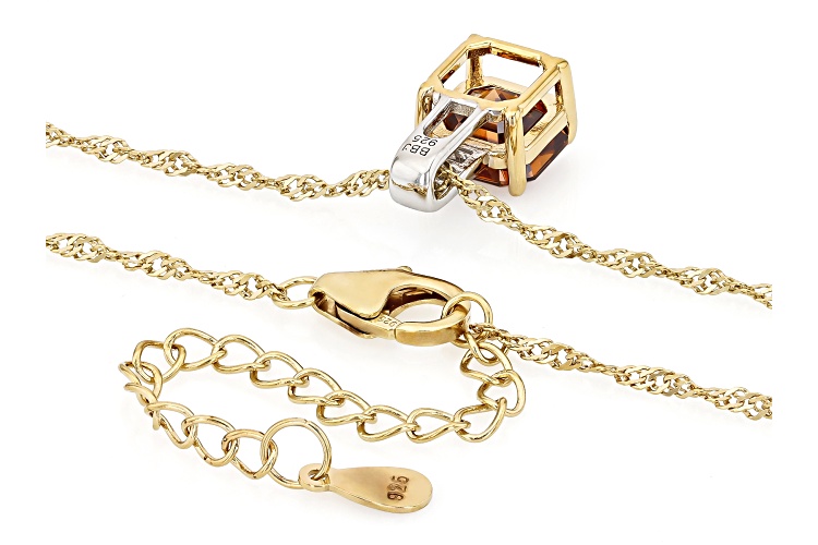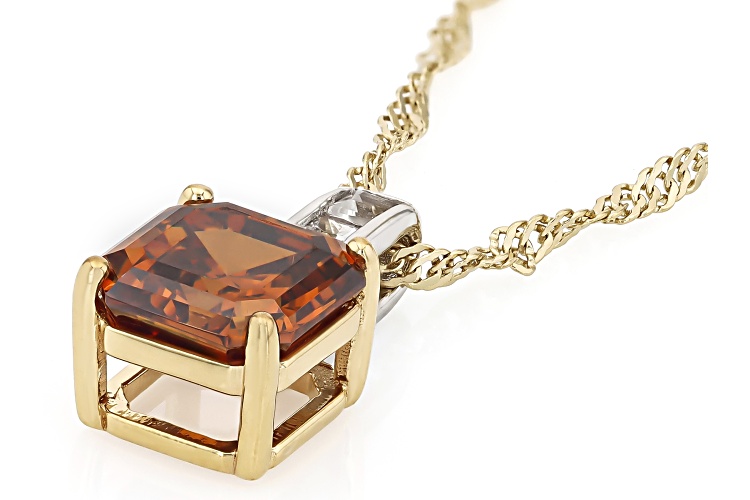 3.25ct Rectangular Octagonal Asscher Cut Lab Created Cognac Strontium Titanate With 0.13ctw Square White Topaz Rhodium & 18k Yellow Gold Over Sterling Silver Two-Tone Pendant With Chain. Measures Approximately 0.59"L x 0.31"W. 3mm bail. Lobster clasp with 2"extender.