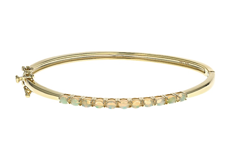 1.03ctw Oval Ethiopian Opal 18k Yellow Gold Over Sterling Silver Bangle Bracelet. Measures Approximately 0.12"W. Box Clasp With Double Safety.