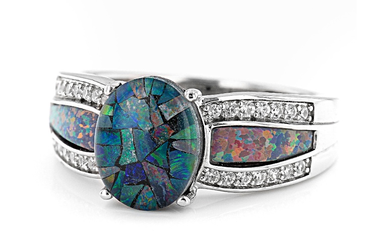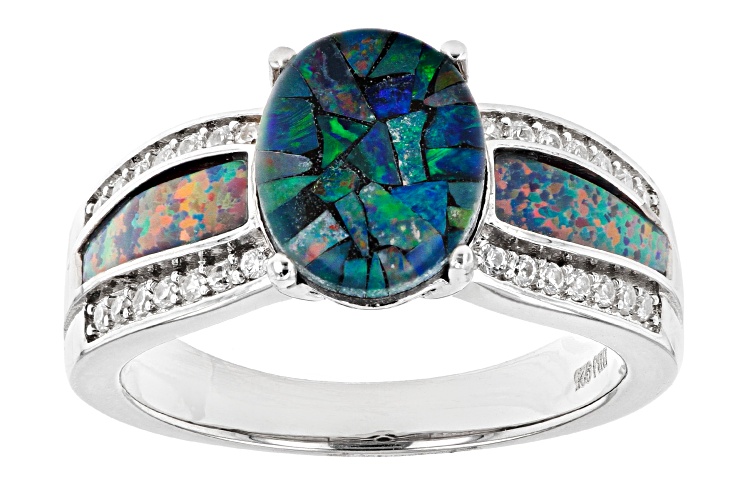 10X8mm Mosaic Opal Triplet, 5x4mm Lab Blue Opal, & .25ctw White Zircon Rhodium Over Silver Ring - Size 7
