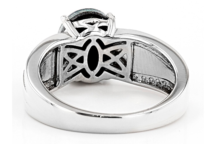 10x8mm Oval Cabochon Mosaic Opal Triplet, 5x4mm Custom Lab Created Blue Opal With .25ctw Round White Zircon Rhodium Over Sterling Silver Ring. Measures Approximately 0.88"L x 0.39"W. Not Sizeable. Accent stones primarily zircon.