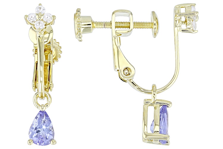 0.68ctw Tanzanite And 0.14ctw White Zircon 18k Yellow Gold Over Sterling Silver Dangle Clip On Earrings. Measures Approximately 0.88"L x 0.19"W. Accent stones primarily zircon.