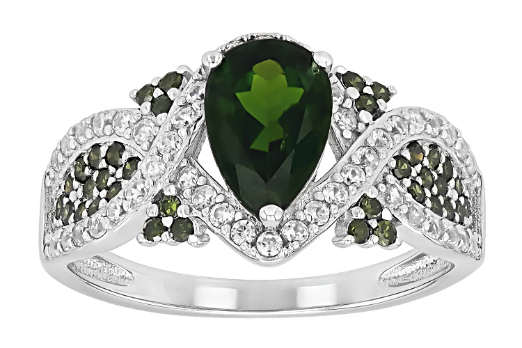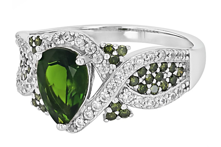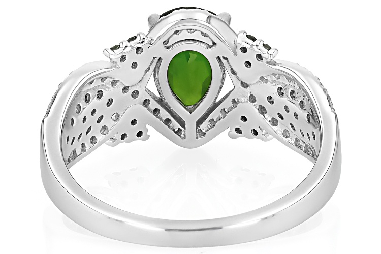1.17ct Pear Shape Chrome Diopside, .27ctw Round Green Diamond With .56ctw Round White Zircon Rhodium Over Sterling Silver Ring. Measures Approximately 0.85"L x 0.46"W. Not sizeable. Accent stones primarily zircon.