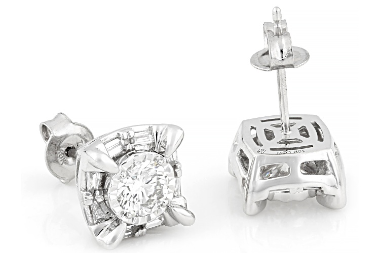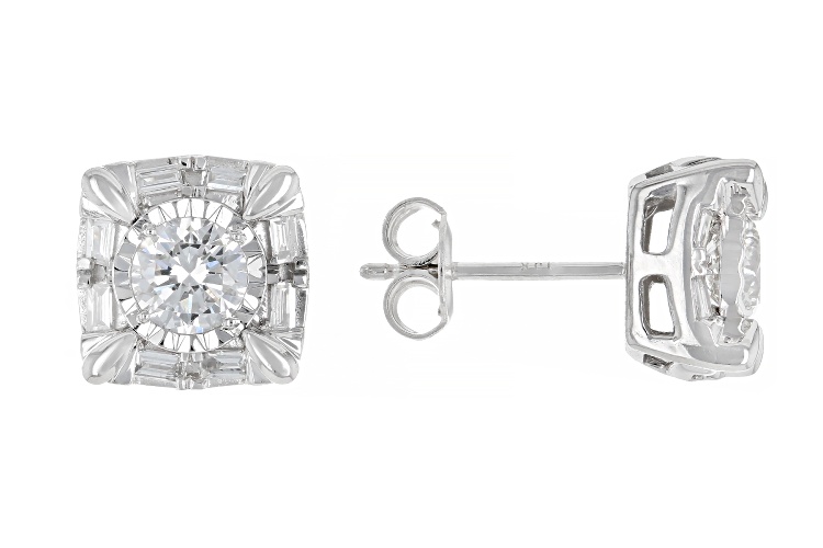 Prazana® Lab-Grown Diamonds 0.76ctw round white lab-grown diamond center stones with 0.24ctw baguette white lab-grown diamond accents, rhodium over 10k white gold cluster stud earrings. Measure approximately 3/8"L x 3/8"W and are secured with push back backings. H color, SI clarity minimum.