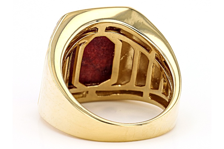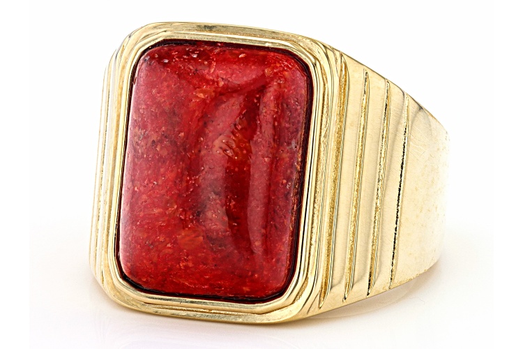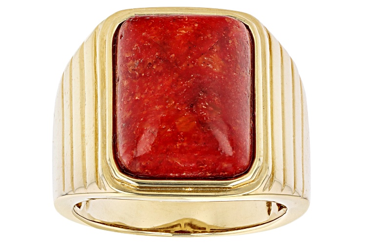 16x12mm Rectangular Octagonal Cabochon Red Sponge Coral 18K Yellow Gold Over Sterling Silver Solitaire Men's Ring. Measures Approximately 0.49"L x 0.65"W. Not sizeable. Finished Under Gallery.
