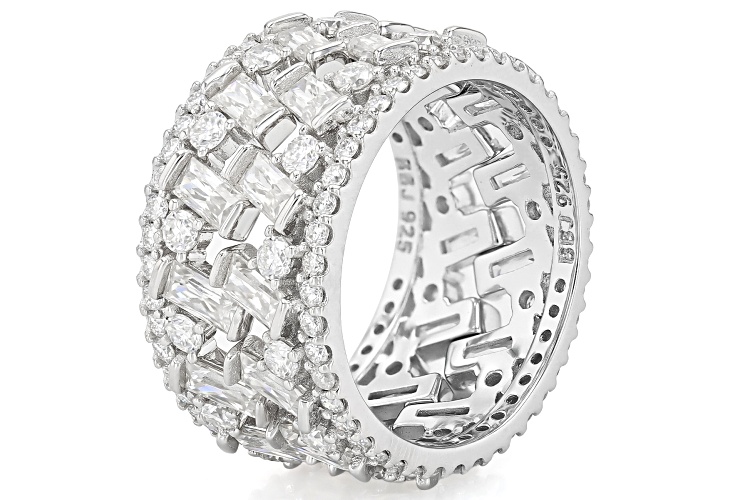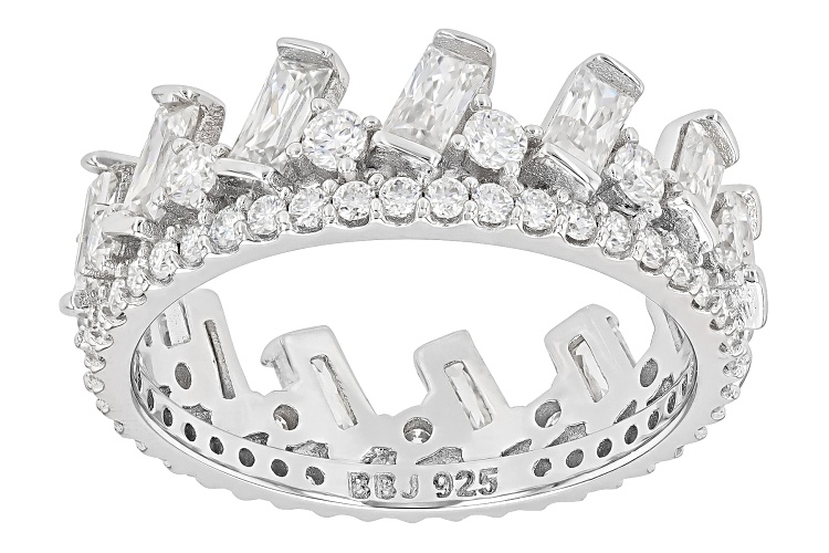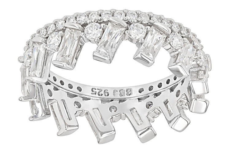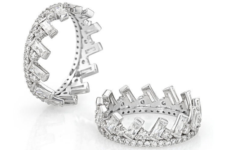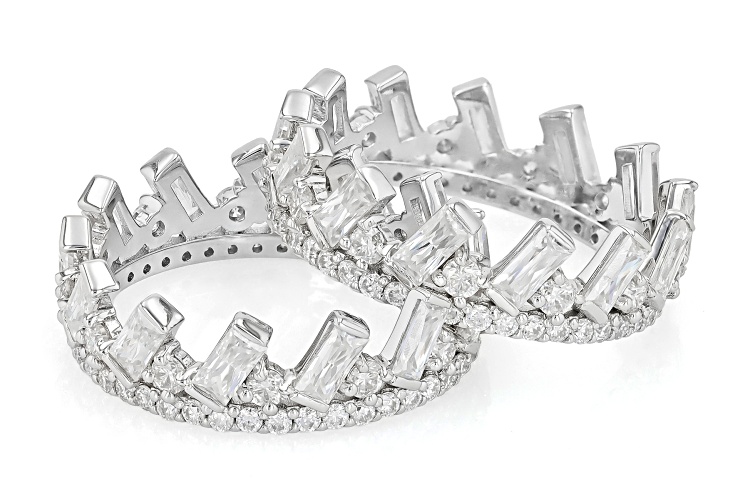 Moissanite Fire® 4.38ctw diamond equivalent weight radiant cut and round brilliant, Platineve® set of two stackable rings. Measures approximately 13/16"L x 3/8"W and is not sizeable. Actual moissanite weight is 4.12ctw.