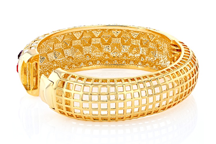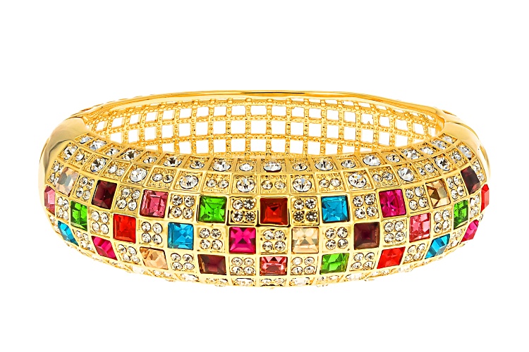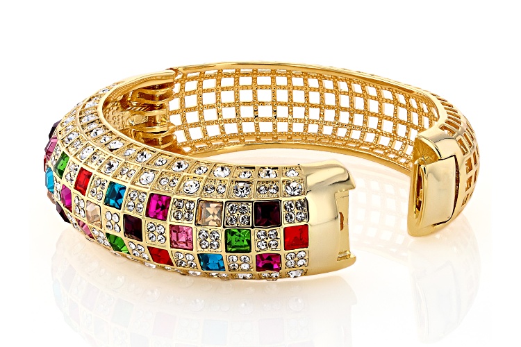 Off Park ® Collection, Multi Color Crystal Gold Tone Bangle Bracelet. Measures approximately 7"L x 0.85"W. Push Button Closure.