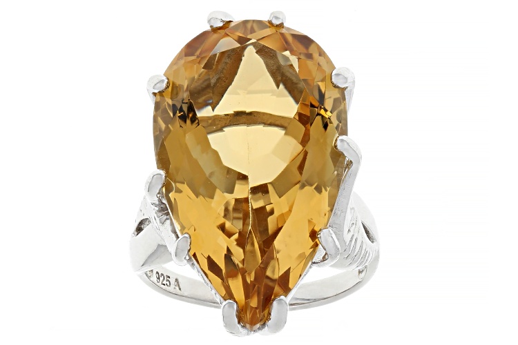 20.00ct 25x15mm Pear Shape Citrine Solitaire, Rhodium Over Sterling Silver Ring. Measures approximately .65"L x 1.01"W Finished under gallery. Not sizeable.