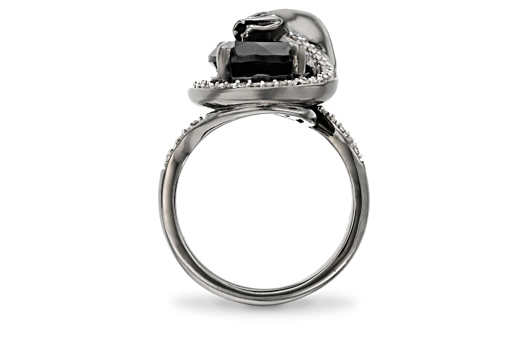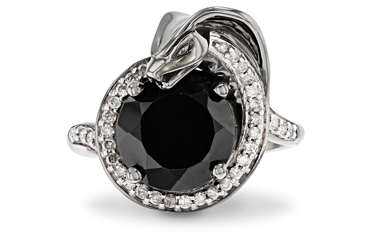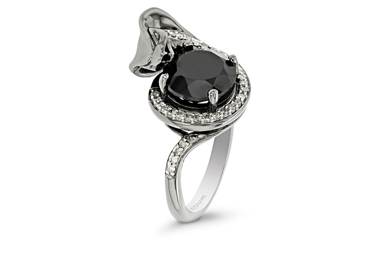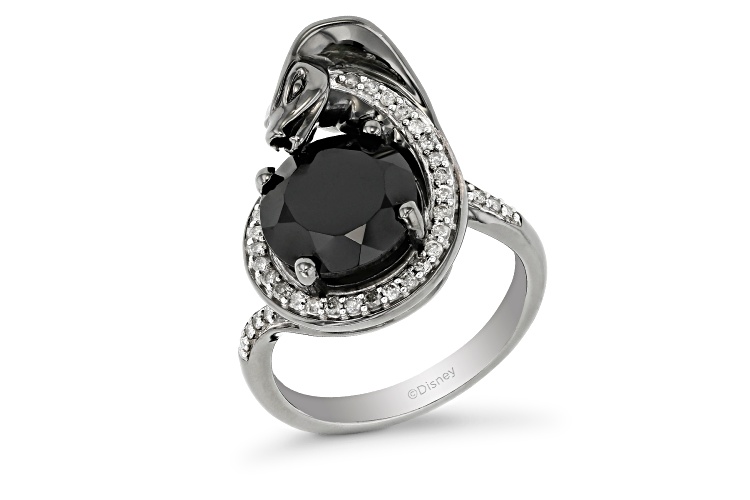 Enchanted Disney Fine Jewelry Villains cobra ring inspired by Jafar. Crafted in black rhodium over sterling silver, this cobra ring features a 1.00ct round black onyx center stone with 0.25ctw of round white diamonds. This ring measures approximately 9/16"L x 5/8"W and is not sizeable. White rhodium enhanced settings around the white diamonds.