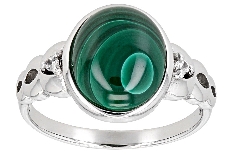 • 11x9mm Oval Green Malachite With 0.03ctw Round White Zircon Rhodium Over Sterling Silver Ring - Size 7