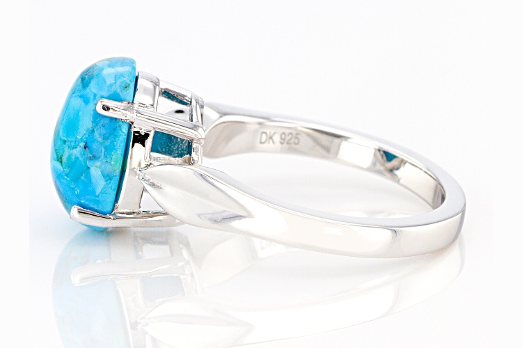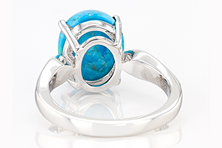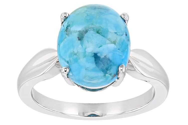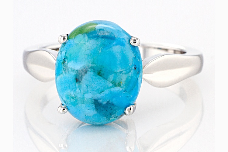 12x10mm Oval Cabochon Composite Turquoise Rhodium Over Sterling Silver Solitaire Ring. Measures approximately .39"L x .47"W. Not sizeable. This product contains composite turquoise. This means separate pieces of turquoise were bound together.