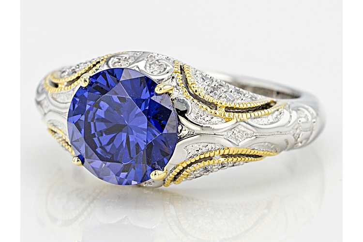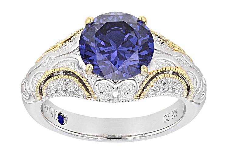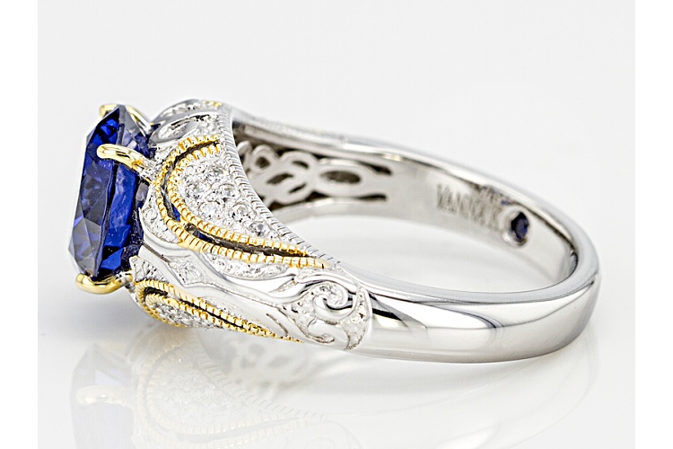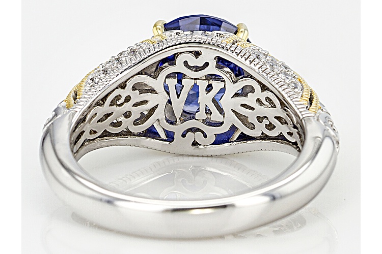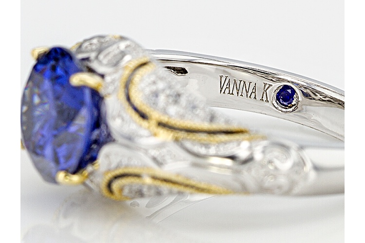 Vanna K ™ for Bella Luce ® tanzanite simulant 4.19ctw round and Bella Luce ® white diamond simulant .26ctw round, Platineve® and Eterno ™ 18k yellow gold over sterling silver ring. Measures approximately 3/8"L x 1/8"W and is not sizeable. Each Vanna K™ design has a signature label that features a lab created sapphire.