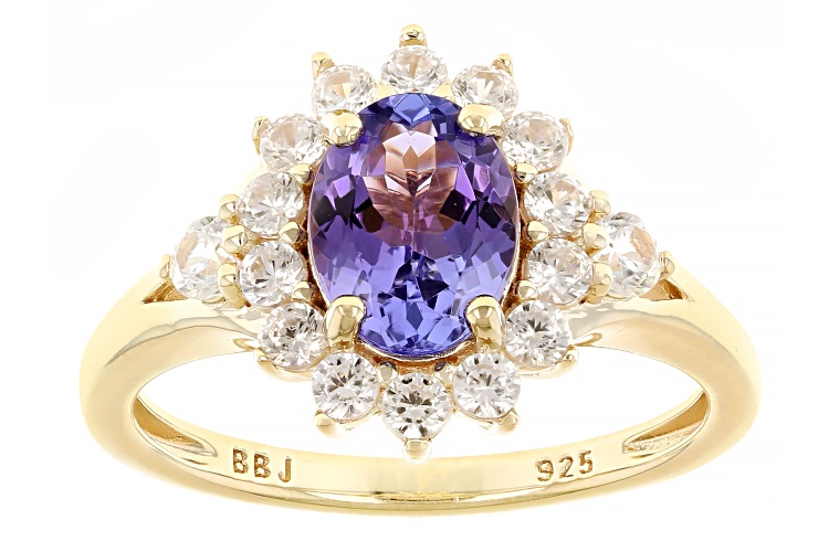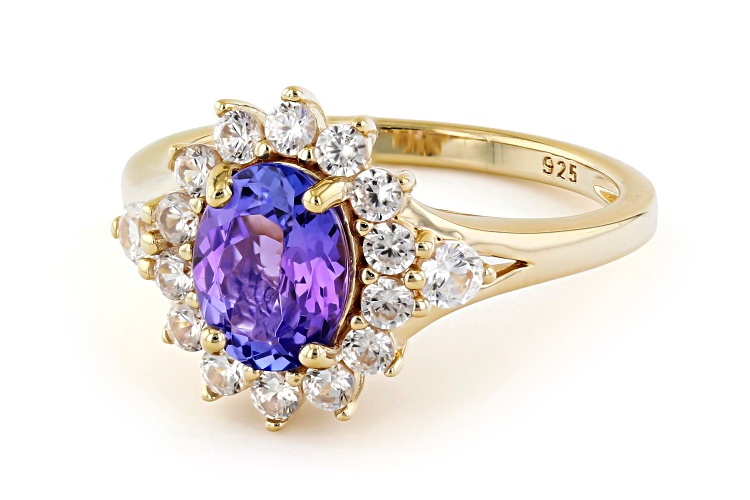 1.10ct Oval Tanzanite With 0.67ctw Round White Zircon 18k Gold Over Sterling Silver Halo Ring. Measures approximately 0.81"L x 0.52"W. Not sizeable. Accent Stones Primarily Zircon.