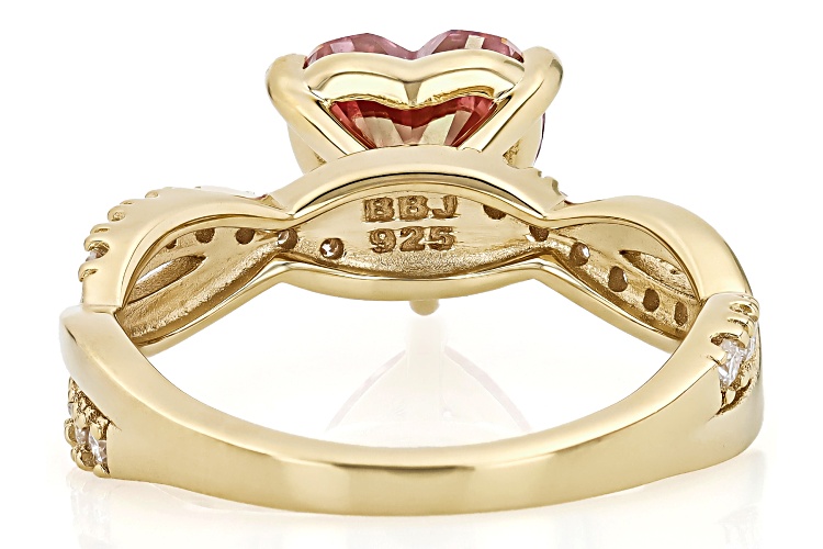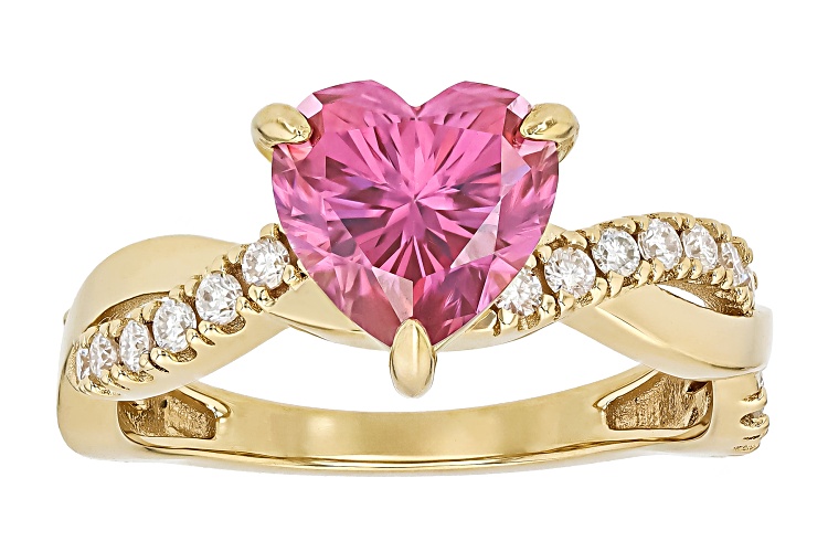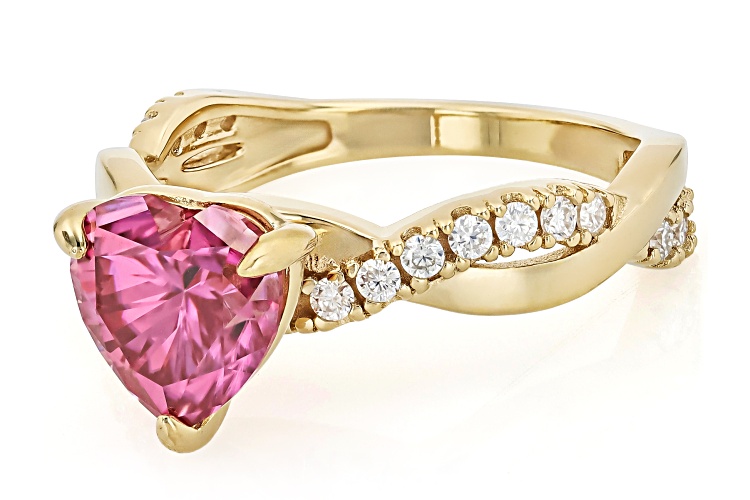 Moissanite Fire® and pink moissanite 2.18ctw diamond equivalent weight heart shape and round brilliant, 14k yellow gold over sterling silver ring. Measures approximately 5/16" L x 5/16" W and is not sizeable. Actual moissanite weight is 1.80ctw
