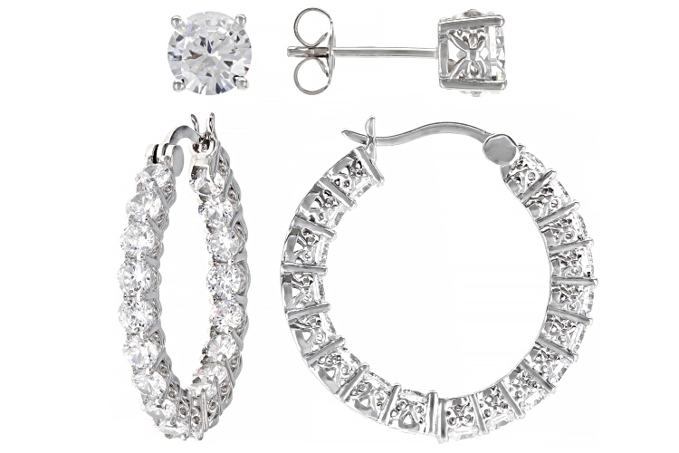 Vanna K™ for Bella Luce® white diamond simulant 9.99ctw round, Platineve(R) hoop and stud earring set. Hoops measure approximately 1"L x 0.13"W and have saddleback closures. Studs measure approximately 0.25"L x 0.25"W and have push back closures. Each Vanna K™ design has a signature a label that features a lab created sapphire. The diamond equivalent weight is 5.64ctw.