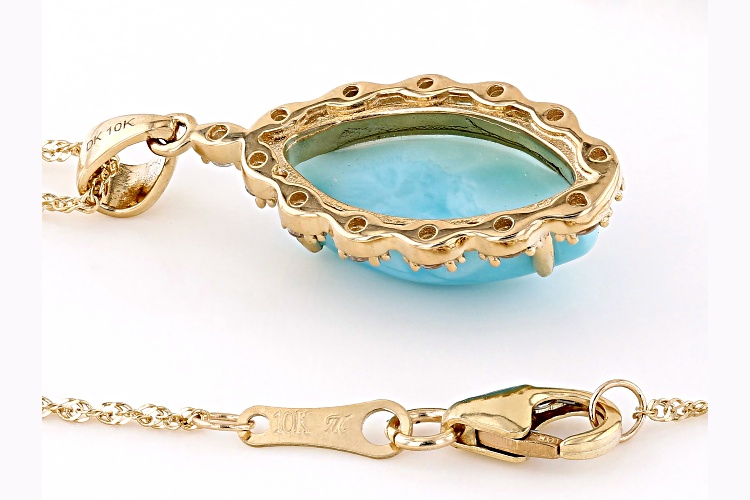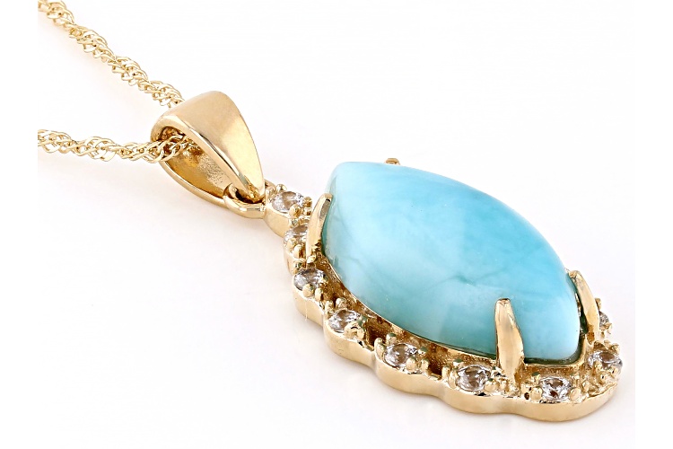 16x8mm marquise cabochon larimar with .25ctw round white zircon, 10k yellow gold pendant with chain. Measures approximately 1.09"L x .43"W. 2.45mm bail. Lobster claw clasp. Accent stones primarily zircon.