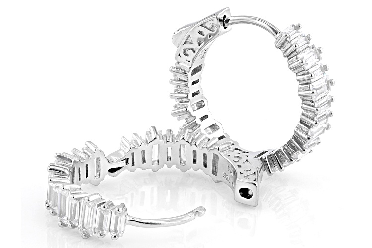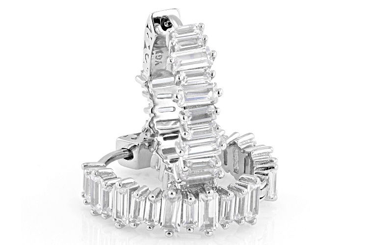 Bella Luce® white diamond simulant 5.16ctw baguette, rhodium over sterling silver hoops. Measures approximately 0.73"L x 0.2"W and have push button lock backings.