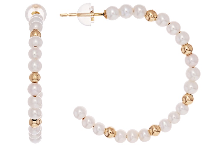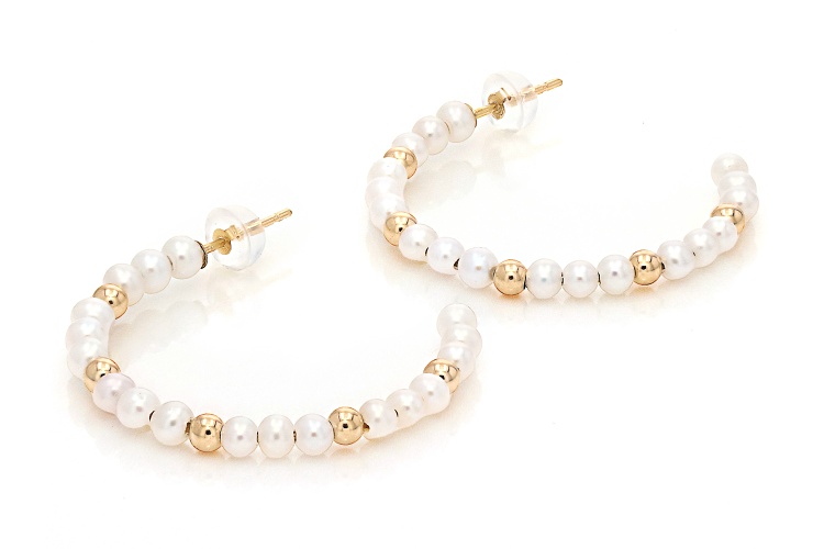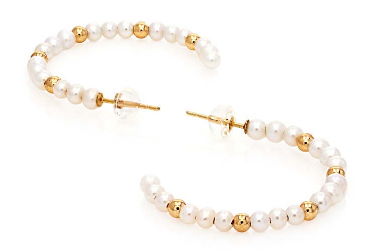 3mm White Cultured Freshwater Pearl 14k Yellow Gold 35mm Earrings. Measure approximately 1 1/4" L x 1/8" W and have bullet back backings. Colors, shapes, and sizes may vary.