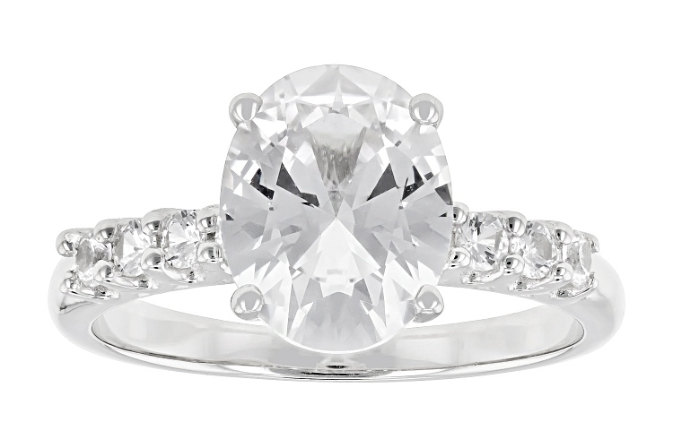 2.55ct Oval And 0.27ctw Round Lab Created White Sapphire Rhodium Over Sterling Silver Ring. Measures Approximately 0.77"L x 0.39"W. Not Sizeable.