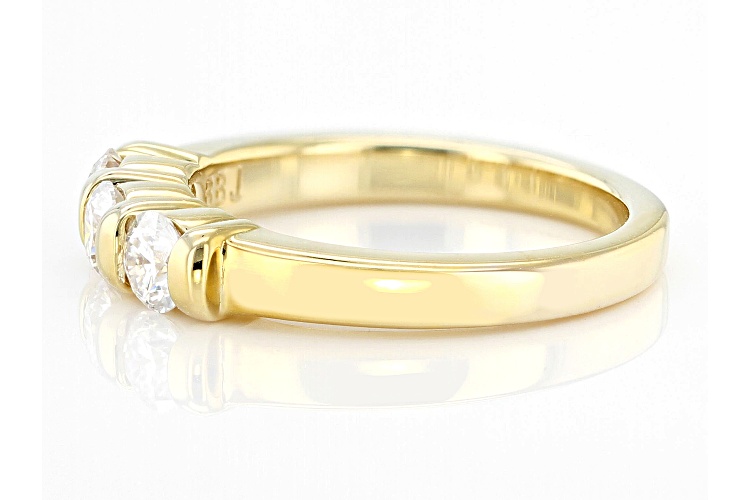 Moissanite Fire® .69ctw diamond equivalent weight round brilliant, 14k yellow gold over sterling silver ring. Measures approximately 1/8" L x 1/16" W and is not sizeable. Actual moissanite weight is .66ctw.